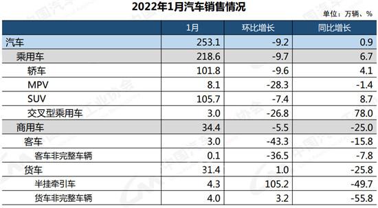 在去年同期基数较高的背景下,全行业共同努力,推动汽车市场2022年伊始呈现出稳定的发展态势。上周五(2月18日),中汽协发布数据显示,1月,汽车产销分别为242.2万辆和253.1万辆,环比分别下降16.7%和9.2%,同比分别增长1.4%和0.9%。中汽协副秘书长陈士华表示,汽车工业实现“开门红”。