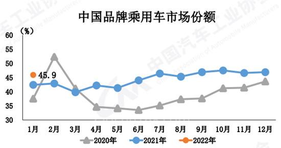 分国别来看,中国品牌乘用车1月共销售汽车100.4万辆,环比下降11.7%,同比增长15.9%,占乘用车销售总量的45.9%,占有率比上月下降1.0个百分点,比上年同期提升3.7个百分点。