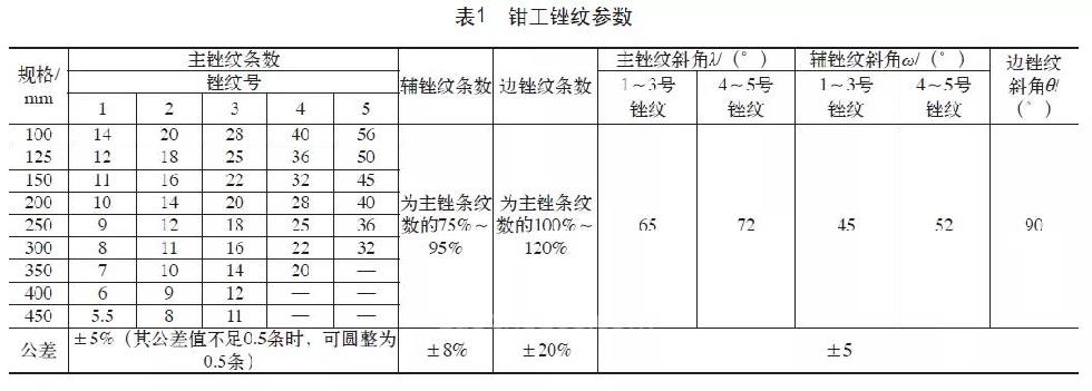 锉刀按粗细可以分为粗齿锉、中齿锉、细齿锉和油光锉。1号为粗齿锉,2号为中齿锉,3号为细齿锉,4号和5号为油光锉。每10mm长度内主锉纹条数越少,锉刀越粗,切削效率越高,但锉削出的平面表面粗糙度越差,锉齿也容易磨损。每10mm长度内主锉纹条数越多,锉刀越细,切削效率越低,但锉削出的平面表面粗糙度越高,锉齿不容易磨损。所以在锉削工件时,应根据工件的材料硬度、工件的表面粗糙度来选择粗细不同的锉刀。钳工锉纹参数见表1。