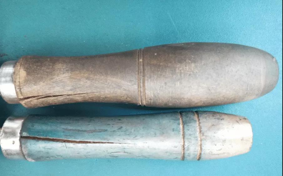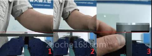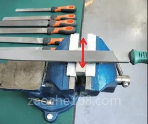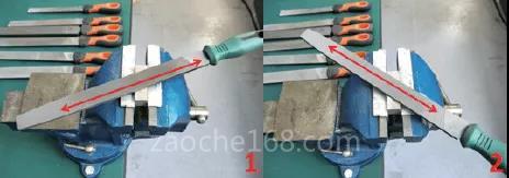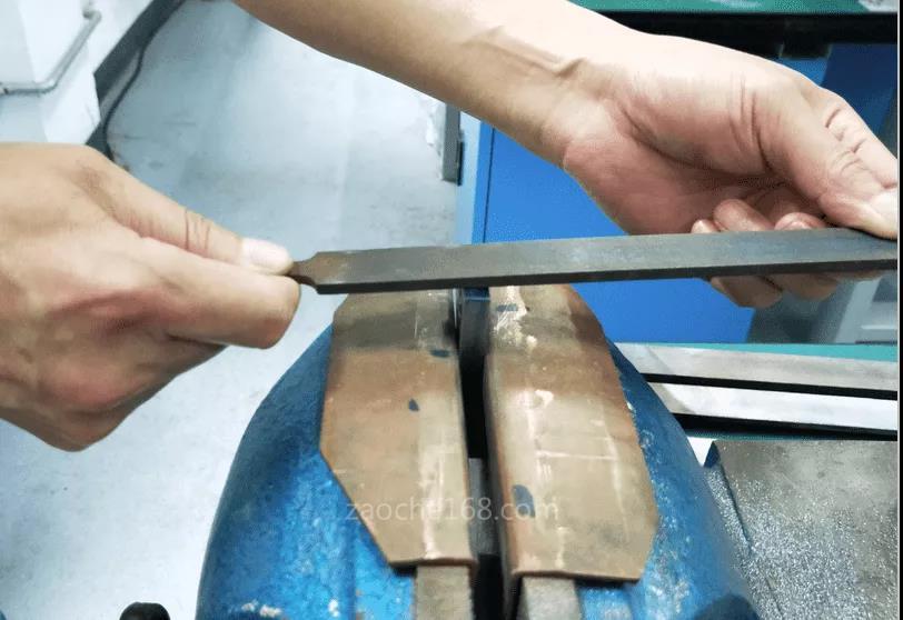 平锉一般没有绝对平直的表面,大多是一面外凸,一面内凹的“弯曲”。当弯曲度很小时,仅凭目测不能判别出哪一面外凸,哪一面内凹,这时就可以将锉刀一面与平板轻轻接触,一只手向锉刀表面施加很小的垂直力,另一只手左右轻晃锉柄,根据摇晃力的大小来判别锉刀的凸面和凹面。当凹面与平板接触,摇晃力稍大,反之则摇晃力较小。