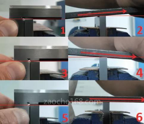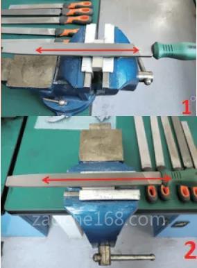 首先通过平板选锉法分辨出锉刀微微凸起的一面,用该面的不同部位对试锉件的表面进行锉削,并对加工过的表面进行平面度检测。当平面度达到理想要求时,在锉刀垂直施力部位做上标记。该标记就是下次使用该锉刀时垂直施力部位。