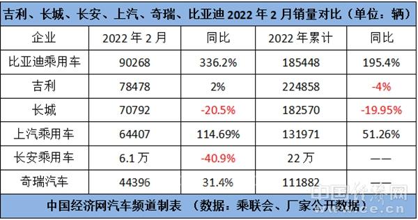 无论是外部造成的冲击,还是内部面临的挑战,都让自主品牌2月的销量排序出现了巨大的变化,原有的“自主三强”格局也没能延续。记者通过梳理厂家公开的数据和乘联会发布的数据发现,2月,比亚迪乘用车、吉利、长城、上汽乘用车、长安乘用车、奇瑞汽车的销量分别为90268辆、78478辆、70792辆、64407辆、6.1万辆、44396辆,同比分别增长336.2%、2%、-20.5%、114.69%、-40.9%、31.4%。