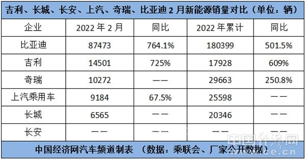 从销量结构来看,比亚迪正是凭借在新能源赛道上的“爆发”,在2月完成了对“自主三强”的“突袭”。数据显示,2月,比亚迪旗下新能源乘用车的销量达87473辆,同比大增764.1%。无论是销量基数,还是增长幅度,比亚迪旗下新能源业务都保有巨大的领先优势。
