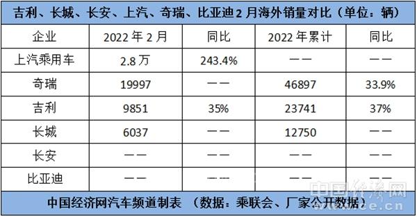 在海外业务方面,上汽乘用车、奇瑞的销量继续保持领先,两家在2月的销量分别为2.8万辆、19997辆。其中,奇瑞目前已在全球建立了六大研发基地、10个海外工厂、1500余家经销商和服务网点,海外总产能达到20万台/年;连续19年位居中国品牌乘用车出口第一。根据规划,奇瑞将努力实现年出口50万辆的目标,进一步加快推进全球化战略。而上汽乘用车同样也努力地在欧洲、澳新等重点市场不断打开新局面。