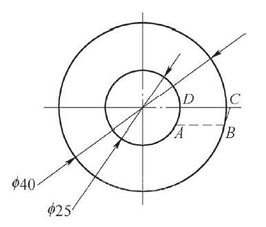 在毫无头绪的情况下,只好请教工厂有经验的车削加工操作人员,经一项一项检查发现,除刀具的车削点较主轴中心线低了1~2mm外,其他均正常,而操作人员认为这不会影响机床的加工精度。考虑到操作人员一直用普通车床,对数控车床不是太了解,又没有发现其他故障,因此对发现的问题在计算机上模拟。小圆的直径为25mm,大圆的直径为40mm,由于对刀点在小圆上,对刀点又低于主轴的中心线,因此实际的切削点为图2所示的A点,而理想的切削点为D点,小圆柱切削完后,实际的切削点移动到B点,而理想的切削点应移动到C点,实际的切削点与理想的切削点组成一个平行四边形。由图2看出,实际切削点越低,C点就会超出大圆越多。由此得出结论:以小圆为对刀点,从小圆柱处起刀,一刀切削工件,当刀具实际切削点较主轴中心线低得越多时,大圆柱直径必然比程序给定的小得越多。这就是造成本次加工精度不达标的真实原因。于是调节刀具的安装高度,使刀尖与主轴中心线等高,再次加工,工件完全达到加工精度要求。