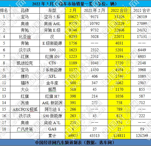 此外,宝马5系和奥迪A6L的新能源车型在2月的销量分别为1177辆、391辆,三款新能源产品的的销量之和达3324辆,市场份额为6.66%。