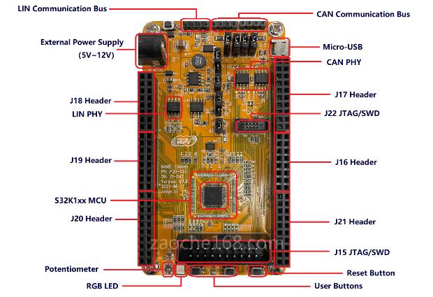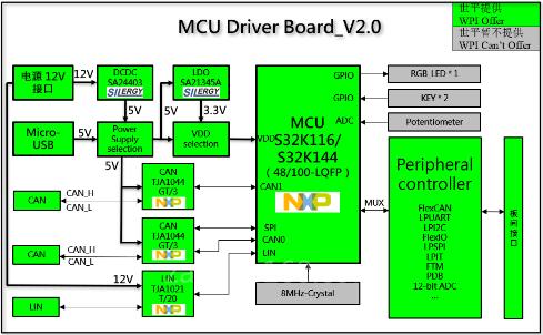 本方案面向通用汽车应用,提供丰富的测试组件,包括:板载CAN、LIN和UART/SCI 接口,并具有microUSB和12V电源两种供电选项,可供用户根据自己的需求灵活选择。此外,方案采用的主控MCU——S32K1xx系列是NXP推出的一系列汽车级通用MCU,其基于ARM®Cortex®-M0+/M4F设计,提供了一个可扩展的平台,具有面向下一代应用的安全性、可扩展性、连接性和低功耗特性。凭借着出色的特性,该系列不仅广泛适用于需要在严苛环境下工作的电力电子应用,也同样满足需要利用引脚的低成本应用。