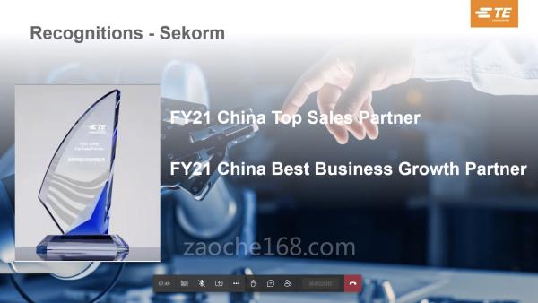 2022年3月17日,TE(中国区)传感器事业部和渠道事业部举行代理商颁奖大会。会上,TE渠道事业部大中华地区销售总监、TE传感器事业部中国区渠道销售经理为世强硬创平台颁发2021财年“中国区最佳销售伙伴奖”(FY21 China Top Sales Partner)与2021财年“中国区最佳业务拓展伙伴” (FY21 China Best Business Growth Partner)。这是首次有代理商同时获得两项分量最重的奖项。