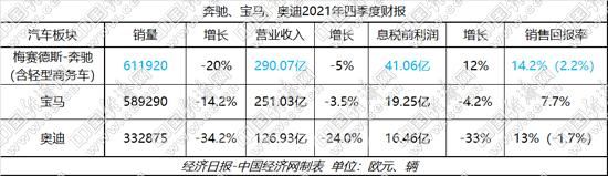 论及盈利能力,奔驰依然当仁不让,无论是去年全年还是四季度,奔驰在营业收入、息税前利润、销售回报率等主要财务指标上均保持领先。相比之下,宝马的这几项财务指标在数值上虽略有不及,但增速均超过奔驰,息税前利润更是同比增长近4倍。奥迪方面,尽管销售回报率也在10%区间,但营收、息税前利润等比之两位德国老乡都有着较大差距。