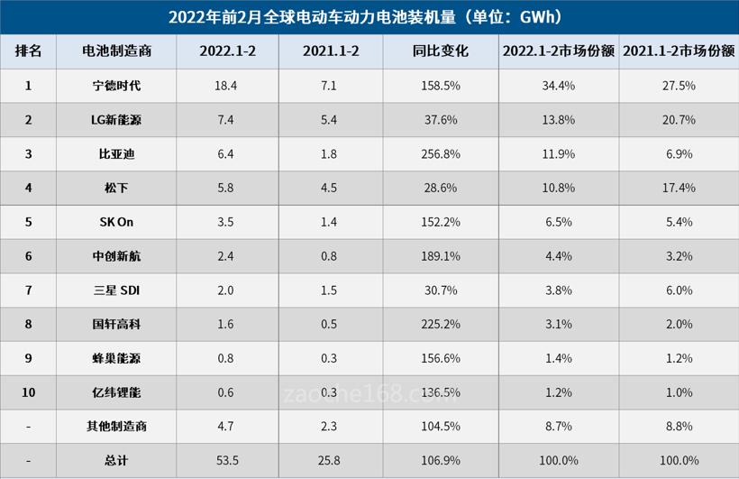 3月31日,韩国市场研究机构SNE Research公布的数据显示,2022年2月,全球电动汽车电池装机量达25.9 GWh,同比增长123.3%,连续第20个月保持稳定增长。中国电池制造商延续了去年的优秀表现,宁德时代稳居第一,中创新航超三星SDI,6家中国电池制造商登榜。