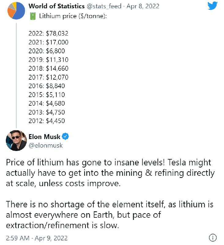 马斯克在推特上写道,“锂的价格已经达到了疯狂的水平。虽然锂元素本身并不短缺,地球上几乎无处不在,但开采、提炼锂的速度很慢。”