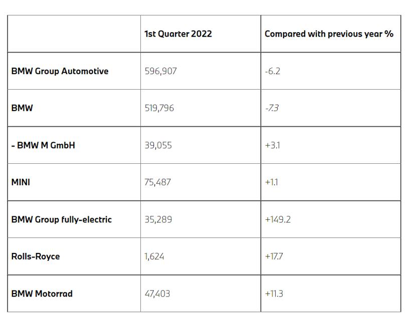 今年第一季度,宝马集团在全球范围内共售出596,907辆汽车,与去年同期(宝马史上最好第一季度业绩)相比下降6.2%。不过,宝马集团电动车在第一季度取得了良好的表现,纯电动宝马和MINI的汽车销量翻了一番以上。