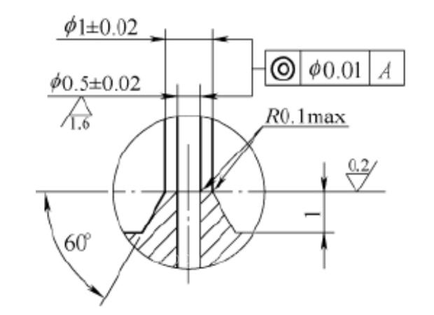 由图1 、图2 可以看出, 深腔小孔精度要求极高:深腔为φ16mm,深度达到了40mm;深腔内小孔为φ(0.5±0.02)mm,且小孔顶部带有凸台形密封面,外圆φ 1mm,小孔直径0.5mm、深度5mm,深腔小孔与凸台形密封面同轴度要求为φ 0.01mm,凸台形密封面与深腔垂直度要求为0.01mm,必须一次装夹加工完成,且不能有任何的偏斜,否则不能满足图样要求。