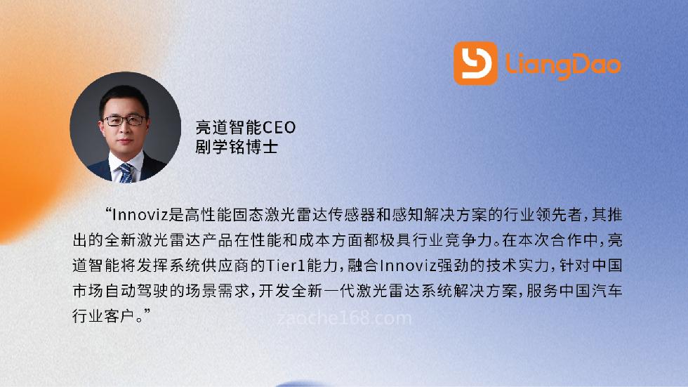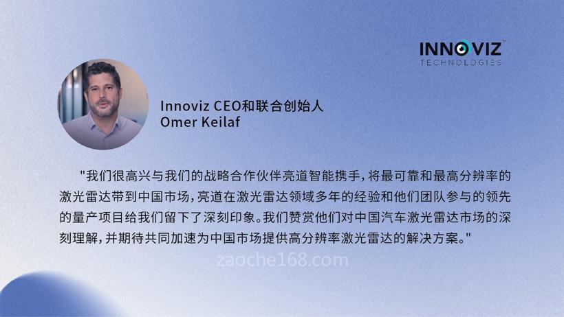 "我们很高兴与我们的战略合作伙伴亮道智能携手,将最可靠和最高分辨率的激光雷达带到中国市场", Innoviz的首席执行官和联合创始人Omer Keilaf说,"亮道在激光雷达领域多年的经验和他们团队参与的领先的量产项目给我们留下了深刻印象。我们赞赏他们对中国汽车激光雷达市场的深刻理解,并期待共同加速为中国市场提供高分辨率激光雷达的解决方案"。