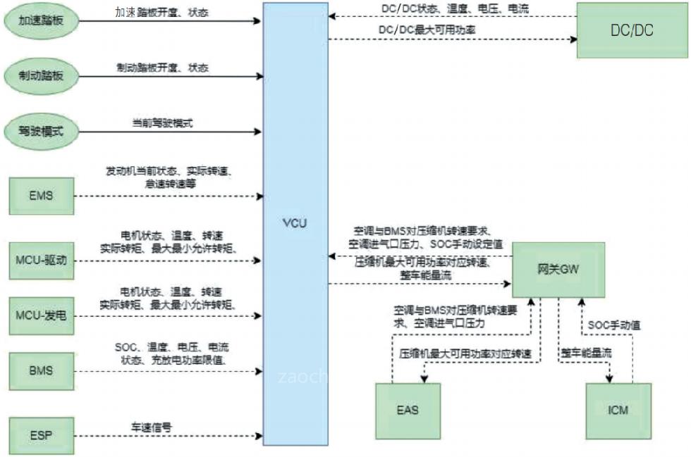 增程式电动汽车整车控制系统主要由增程器发动机控制单元(EMS)、发电机控制单元(GCU)、驱动电机控制单元(MCU)、动力蓄电池管理单元(BMS)、具备增程器协调控制的整车控制单元(VCU)和CAN/CANFD网络通信系统组成。增程式电动汽车整车控制系统原理,如图1所示。