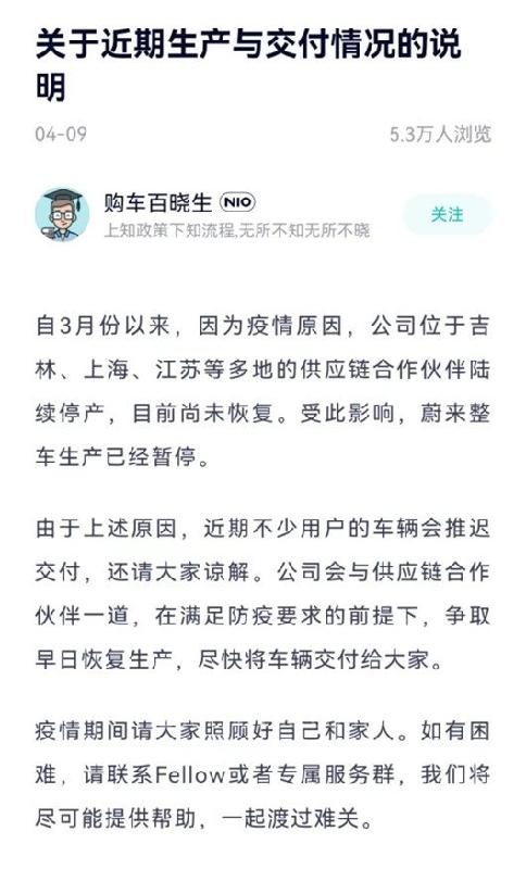北京时间4月9日,其官方APP发布情况说明:自3月份以来,因为疫情原因,公司位于吉林、上海、江苏等多地的供应链合作伙伴陆续停产,目前尚未恢复。受此影响,蔚来整车生产已经暂停。