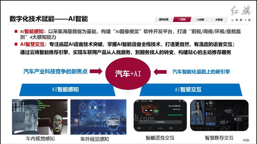 谈到数字化技术一定离不开AI人工智能,汽车+AI现在已经成为整个产业科技竞争的全新焦点,也是我们汽车走向智能化道路上的全新引擎。目前我们红旗产品主要在AI智能感知和AI智慧交互方面进行了深入的研发和探索,在AI感知,我们以采集海量的数据为基础,构建AI图像视觉软件开发平台,打造前视、周视、环视、座舱内的检测多维度感知能力。在智慧交互方面专著于底层AI语音技术突破,掌握AI智能语音全栈技术,通过AI车和人通过语音的互动,能够实现更加自然,更有温度的语音交互。通过云端的智能推荐引擎,实现车联网产品从人找服务,到服务找人的转变,主动的推荐服务更直达用户,服务能够更加的贴心。