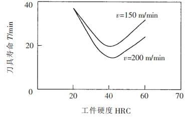 硬态车削GCr15淬火轴承钢时,其磨损状况与工件的硬度有关,关系曲线如下图。我们通过该试验可发现PCBN刀具加工硬度为HRC40时刀具的磨损最为严重,超过或低于这个硬度时,刀具的磨损都不大。造成该情况是因为PCBN立方氮化硼材料高温下硬度损失小,工件硬度很高时,由于切削热作用使切削区域金属软化从而使切削加工便于进行,因此PCBN刀具更适合车削加工高硬度淬火轴承钢。