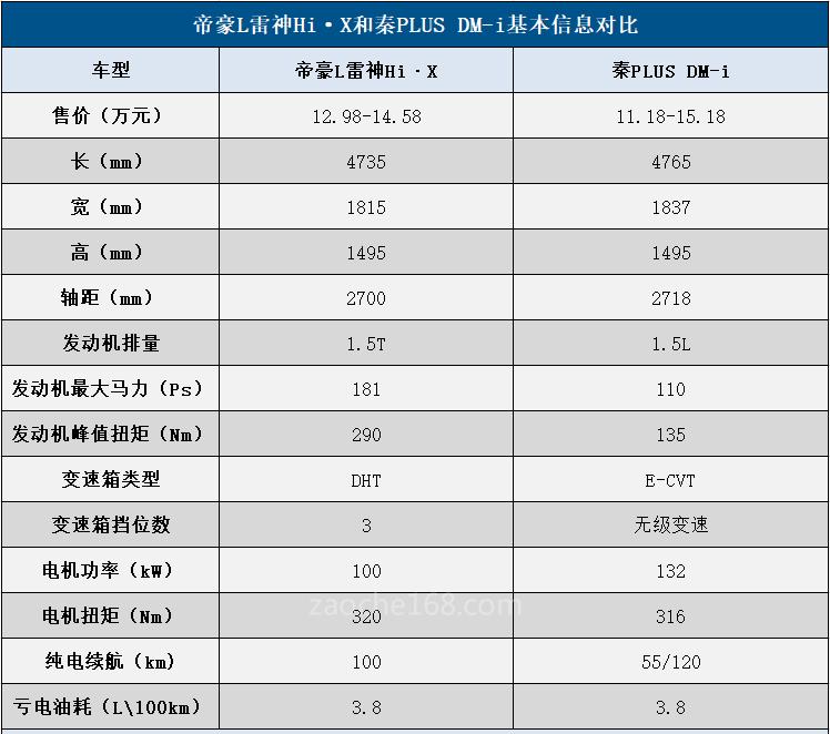 通过上面的表格可以看出,两款车关键配置上的选择凸显出了两种不同的风格取向。比亚迪秦PLUS DM-i可以看作是全方位的低油耗价值取向,而帝豪L雷神Hi·X在兼顾油耗的同时,还想要追求更高的驾驶乐趣。