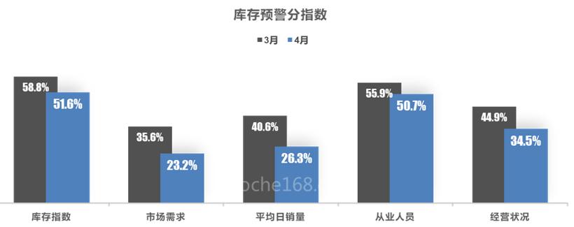 4月份,各地疫情尚未得到有效遏制,多地防控政策升级,经销商整体经营受到较大影响。从分指数情况看,4月经销商库存、市场需求、平均日销量、从业人员、经营状况指数均呈现环比下降态势。