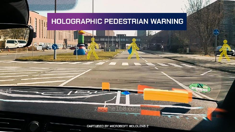 该系统将虚拟对象投放在汽车内外部。HoloLens 2将虚拟地图投影到汽车仪表板上,如导航箭头和关键十字路口的信息。HoloLens 2还在人行横道处显示全息行人警告,提醒驾驶员小心。此外,HoloLens 2还可显示车内温度。