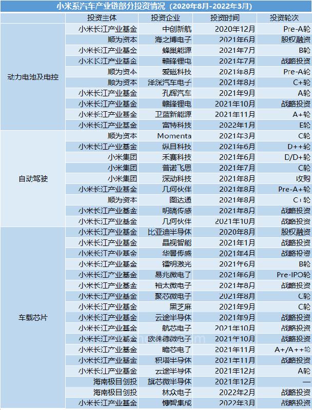 据不完全统计,自去年以来,小米系资本在汽车产业链上的投资约40家。按照行业人士的说法,“小米在自动驾驶、车载芯片和动力电池领域的投资力度堪称‘圈内之最’”。