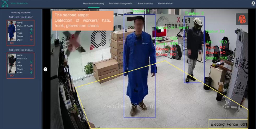 我们以某品牌汽车生产工厂为示范园区,对生产线上的人员、车间安全围栏、不同环境生产人员穿戴规范以及不同生产阶段的生产人员穿戴规范进行识别。