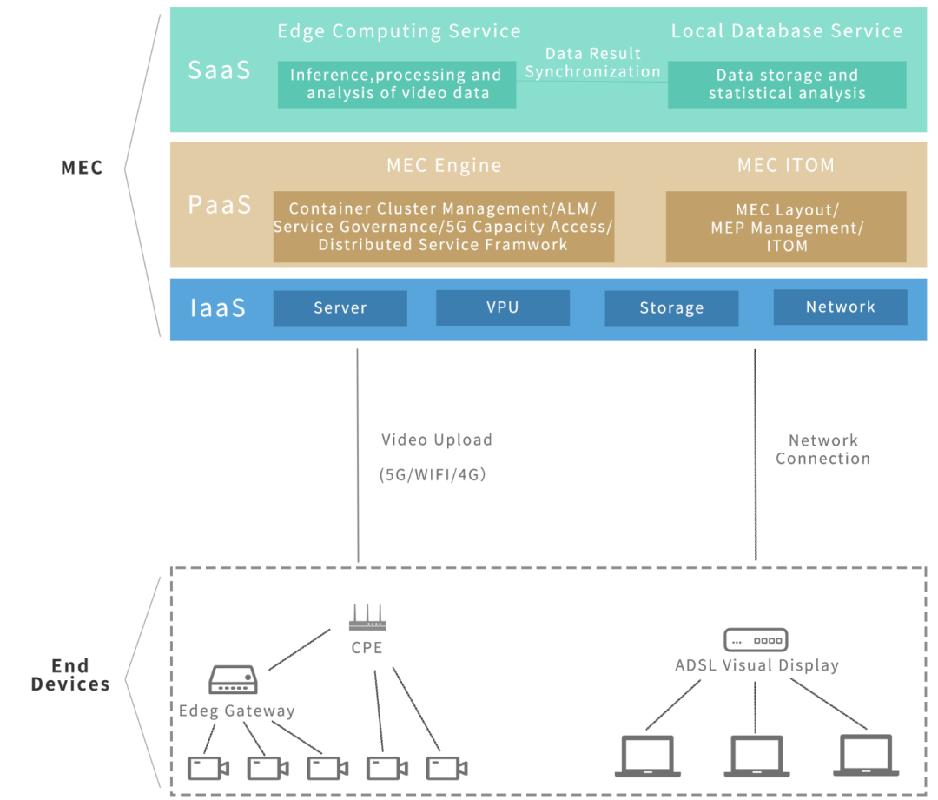 考虑到工业工作场所数据的安全性,该解决方案在本地部署,采用端边框架。其中,端对应视频采集终端,边对应边缘计算服务平台。