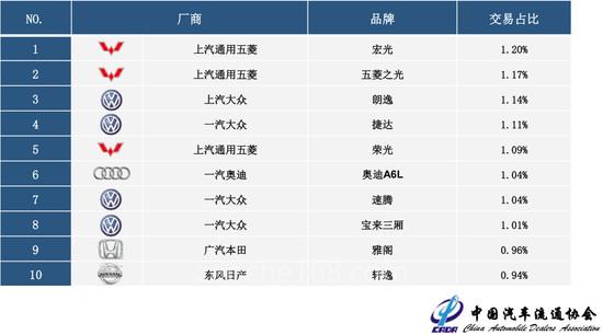 今年一季度,上汽通用五菱、上汽大众、一汽大众、一汽奥迪、广汽本田以及东风日产旗下的10款车型在二手车总交易量中占比高达10.69%,五菱宏光、之光、荣光三款MPV纷纷上榜,其余均为轿车车型,包括朗逸、捷达、奥迪A6L、速腾、宝来三厢、雅阁以及轩逸。