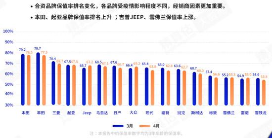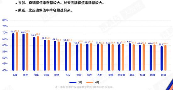 较大的交易量代表着消费者的认可,同时也支撑了其在二手车市场中的保值率。根据最新数据,4月,本田、日产、大众三年车龄保值率均在65%以上,自主品牌中五菱也以70.3%的保值率高居榜首。