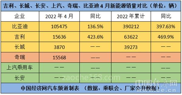 比亚迪之外,只有吉利和长城公开了自家新能源产品在4月的销量。数据显示,4月,吉利和长城旗下新能源产品的销量分别为15636辆、3870辆;1-4月的累计销量分别为63622辆、39273辆。