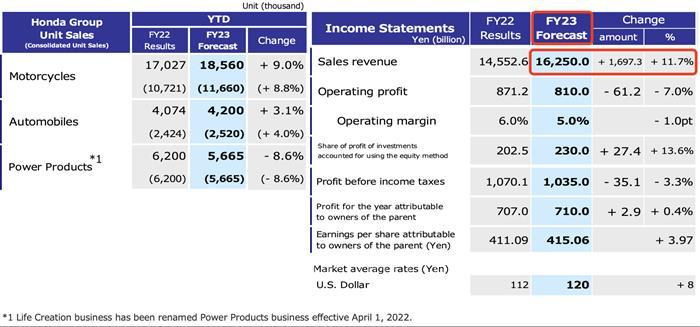 本田汽车在财报中表示,预计2023财年净销售额为16.25万亿日元,同比增长11.7%,高于市场预期的16.2万亿日元。营业利润将为8100亿日元(约合63亿美元),同比下降7%,不及市场预期的9430亿日元。