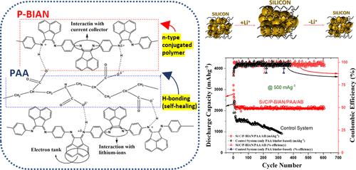 该粘合剂是一种聚合物复合材料,由n型导电聚合物聚(双亚氨基苊醌)(P-BIAN)和含羧酸盐的聚合物聚(丙烯酸)(PAA)组成,且均通过氢键相互连接。