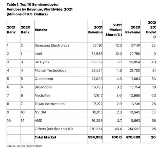 在业界较为关注的Top 10半导体供应商排行榜里,三星电子、英特尔、SK海力士、美光科技、高通、博通、联发科、德州仪器、英伟达和AMD成为2021年营收最强的行业巨头。三星的芯片业务最为生猛,去年销售额排名全球第一,这也是该公司自2018年以来首次超越英特尔,重回冠军的宝座。