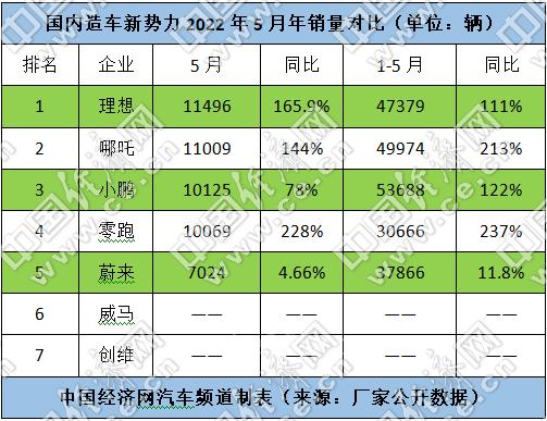 具体来看,5月,理想、哪吒、小鹏、零跑和蔚来的销量分别为11496辆、11009辆、10125辆、10069辆、7024辆,同比分别增长165.9%、144%、78%、228%、4.66%;前5个月的累计销量分别为47379辆、49974辆、53688辆、30666辆、37866辆,同比分别增长111%、213%、122%、237%、11.8%。