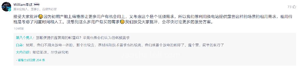 对此,蔚来汽车创始人、董事长、首席执行官李斌回应称,初期产能上得慢,想让更多用户有机会用上,又考虑这个是低频需求,所以想利用换电站提供露营这样的场景的租用需求,租用价格考虑了闲置时间和人工,没想到有这么多用户有买的需求。“我们接受大家的批评,会尽快讨论更多的服务方案。”