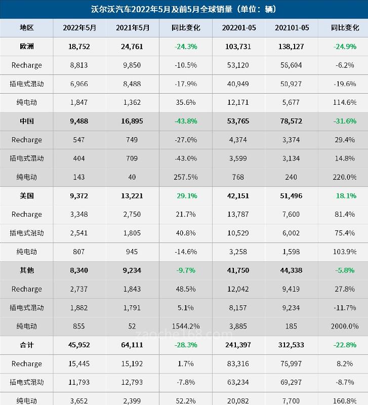 6月2日,沃尔沃汽车公布其5月全球零售销量同比下降28.3%至为45,952辆,Recharge车型(包括纯电动汽车和插电式混合动力汽车)的销量占总销量的33.6%,同比增长10个百分点。值得一提的是,沃尔沃汽车纯电动汽车占比较去年同期增长至7.9%。