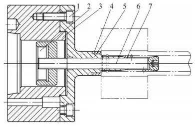 1—螺钉 2—接套 3—法兰盘 4—定位块 5—夹具体 6—拉心 7—胀瓦