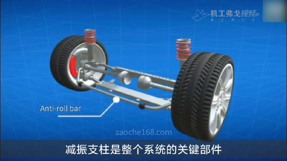 在双叉臂悬架系统中,车轮安装在轮毂上,轮毂有上、下两个与车架一起枢转的连杆。在车架与带有柔性接头的下连杆之间还有减振器。当车辆在不平路面上行驶时,车轮的冲击力通过下连杆传递给减振器,减振器将其吸收。上连杆用来保持车轮的外倾角。这种系统既复杂又昂贵,且需要更多的空间。