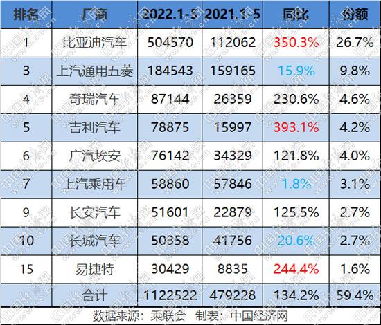 在乘联会发布的5月新能源乘用车批发销量厂商排名(TOP15)中,传统品牌新能源虽相比4月市场份额略有下降,但依然占据超过六成份额,达到64.8%。其5月共销售27.2万辆,同比增长157%,占据TOP15中的10席,并包揽了前9排名中除特斯拉以外的所有席位;1-5月,传统品牌新能源累计销售112.3万辆,同比增长134.2%,份额亦是接近六成。