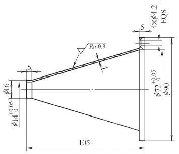 操作法内容:某超薄杯形件为超薄1Cr18Ni9Ti不锈钢零件,零件结构如图1所示。该零件结构类似于漏斗,大端孔径φ72图片mm,小端直径为φ14图片mm,壁厚1mm,中间是16°锥度过渡连接,是典型的薄壁杯形零件。该杯形件壁厚薄,表面粗糙度值要求Ra=0.8μm。该材料机械加工性能差,有以下几个原因: