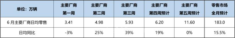 根据乘联会最新周度分析数据,6月1-19日全国乘用车市场零售93.5万辆,同比去年增长24%(较上月累计同比增速提升42个百分点),环比上月增长43%;全国乘用车厂商批发94.4万辆,同比去年增长34%(较上月累计同比增速提升57个百分点),环比上月增长52%。