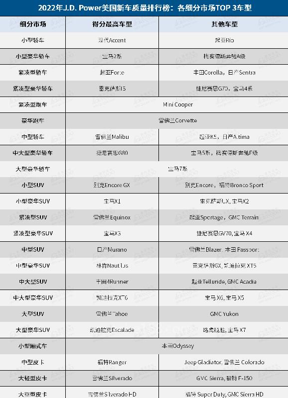 由此看出,通用汽车是今年榜单中的最大赢家,旗下四个品牌(别克、雪佛兰、凯迪拉克、GMC)的新车质量普遍提高,因此通用在汽车制造商中排名最高。别克从2021年的第12名跃升为今年排名最高的品牌。雪佛兰Corvette是美国新车质量最高的车型,每100辆车有101个质量问题。此外,通用汽车的车型获得的奖项最多,其次是宝马。在高端品牌中,捷尼赛思在美国的新车质量最好,排名第4。