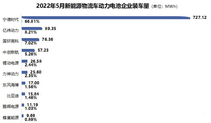 数据显示,5月新能源物流车动力电池企业装车量TOP10分别是:宁德时代、亿纬动力、国轩高科、中创新航、锂动电源、力神动力、东风海博、比亚迪、鹏辉电源、蜂巢能源。