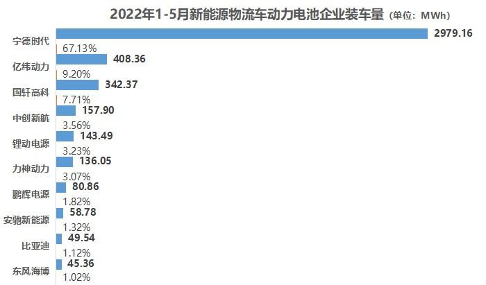 2022年1-5月,我国新能源物流车市场共有70余家动力电池企业实现装车配套,合计装车量为4.44GWh。
