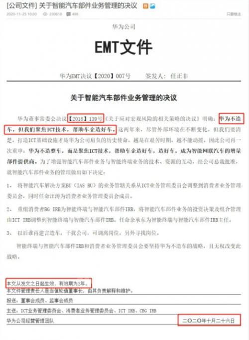 7月5日消息,据凤凰网科技报道,华为不造车的承诺即将过期。据由华为创始人任正非签发【2018】139号华为EMT决议:华为不造整车,而是聚焦ICT技术,帮助车企造好车,但声明末尾显示:“本文从发文之日起生效,有效期为3年”。