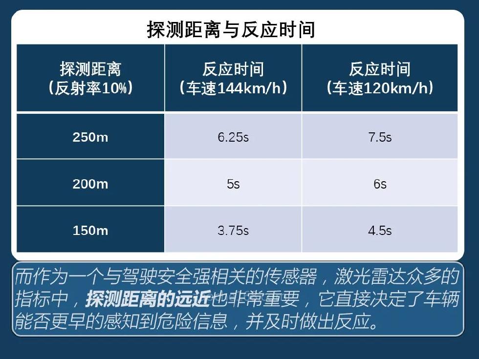 所以在看激光雷达的探测距离时,你需要像确定续航/油耗成绩的工况一样,先瞅一眼这个成绩对应的反射率究竟是多少。而同在10%这个比较极限的状态下,激光雷达的探测距离也基本代表了它探测能力的下限,对于比较、判断激光雷达的好坏是一个很客观、有效的指标。