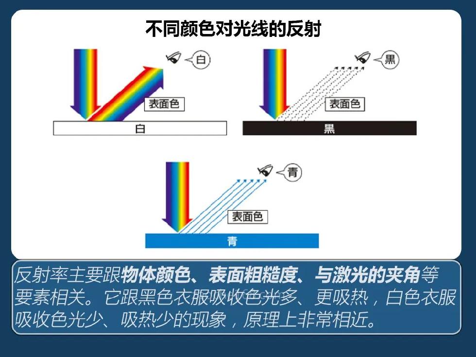 反射率可以简单理解为照向障碍物的光线有多少能被反射回来,是被探测物体反射的激光能量占总发射能量的百分比。像用手电筒看路的过程一样,如果手电筒的光大都被前面的物体吸收了,反射回来的光线就不够让人看清前面有什么,反射率低的物体也容易“消失”在激光雷达的视野里。