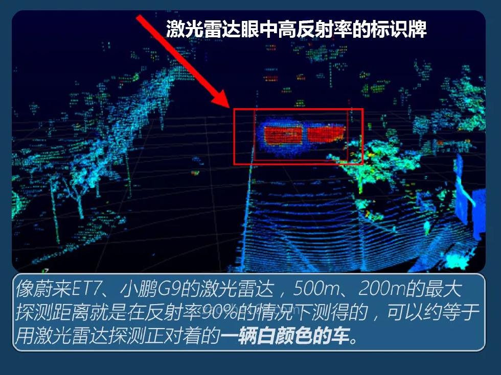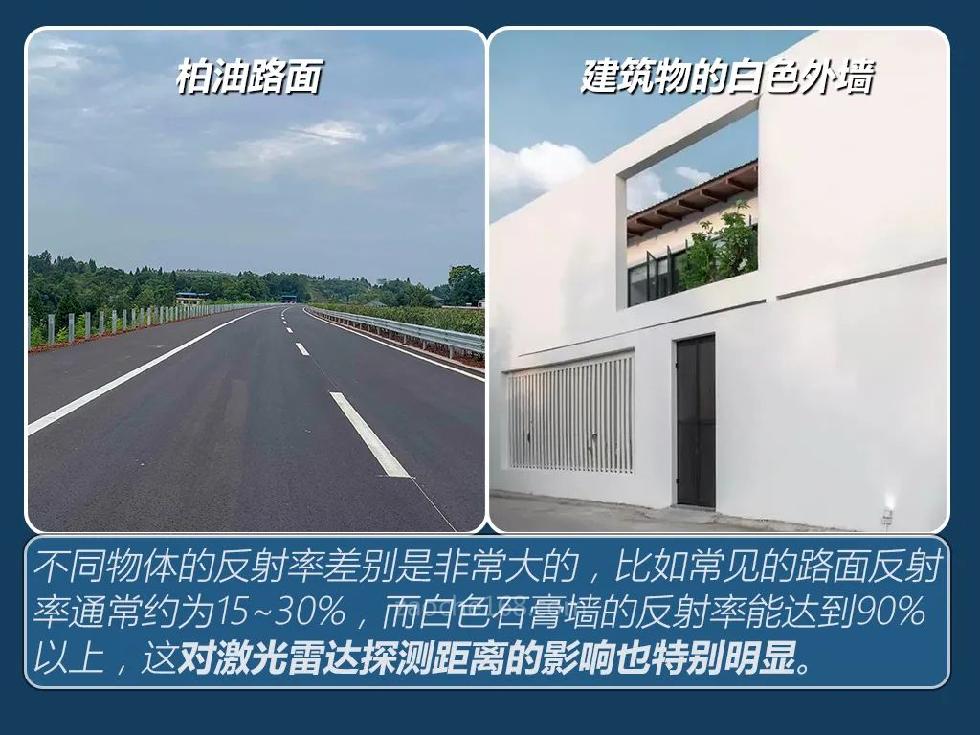 但车企在宣传激光雷达的探测距离时,经常会有两个成绩。比如蔚来ET7使用的激光雷达,就有500m和250m两个数值。而这两个相差一倍的数字,并不是存在什么“猫腻”,而主要跟反射率条件相关,它就像在聊电动车续航时,我们需要先明确NEDC/CLTC/等速这些工况作为前提。