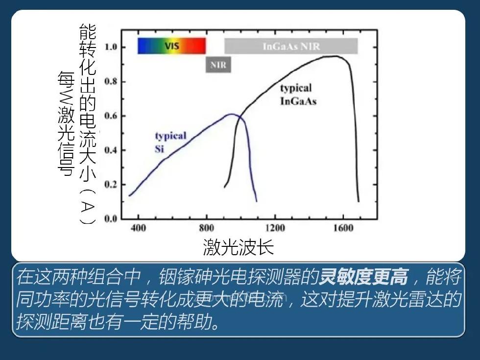 最后,物体反射回来的激光,还需要被光电探测器转化成电信号,再由信号处理模块进行识别和处理。光电探测器的灵敏度高低,也是激光雷达“眼神”好不好的重要指标。由于不同类型的半导体材料,对不同波长的激光灵敏度不同,905nm激光通常使用硅基光电探测器,1550nm激光则需要搭配价格更贵的铟镓砷光电探测器。